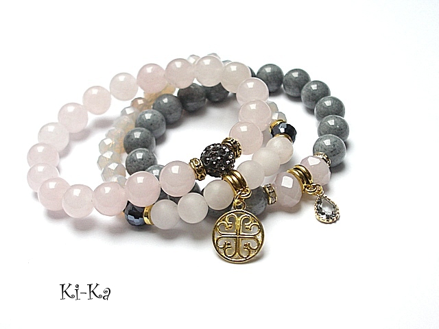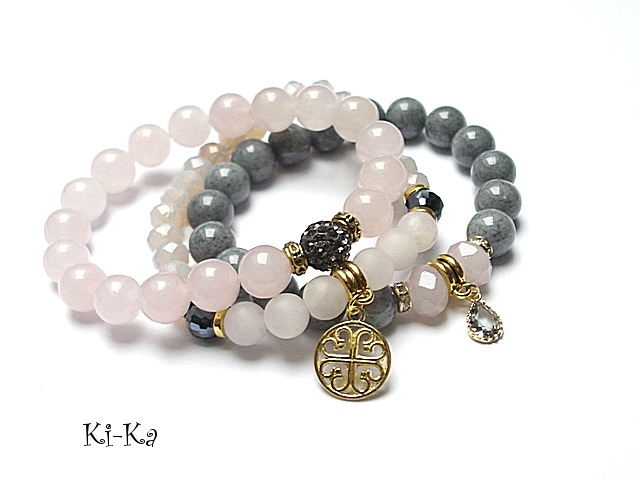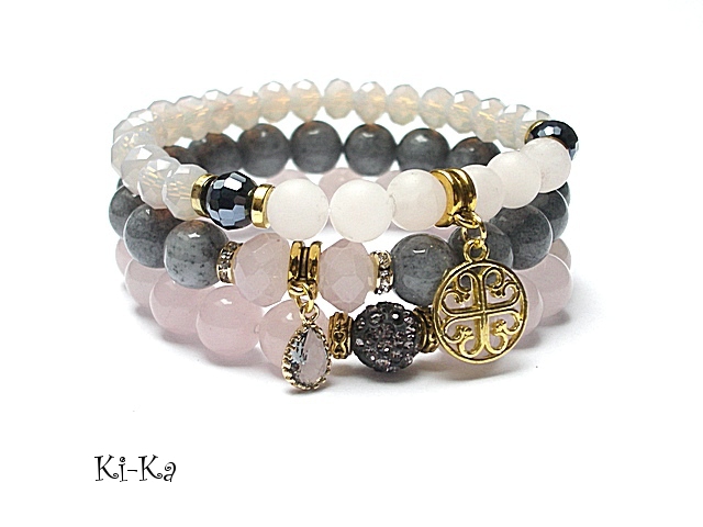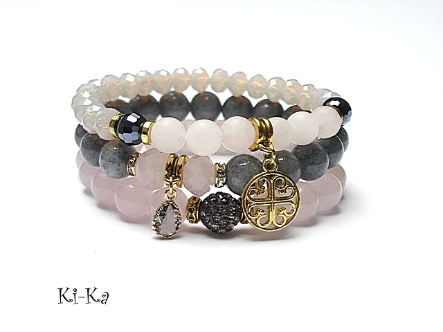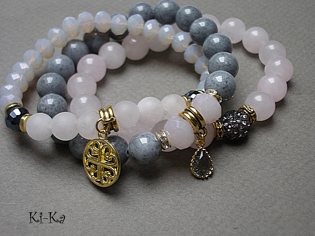 PROJEKT AUTORSKI. WŁASNOŚĆ KI-KA. KOPIOWANIE ZABRONIONE. Komplet trzech bransoletek wykonanych z naturalnych kamieni: jadeity,kwarc różowy [8mm] kryształków fasetowanych [10mm i 8mm] przekładki shamballa wysadzanej kryształkami Swarovskiego [10mm] przywieszki w okuciu [mosiądz platerowany złotem] oraz elementów metalowych w kolorze złota. Bransoletki pasują na nadgarstek 16-17cm.Biżuteria ozdobnie zapakowana