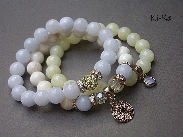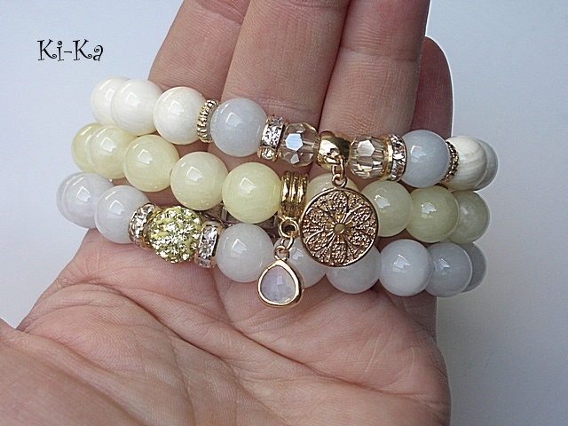 PROJEKTY AUTORSKIE. WŁASNOŚĆ KI-KA. KOPIOWANIE ZABRONIONE. Komplet trzech bransoletek w kolorystyce pastelowej wykonanych z naturalnych minerałów: jadeity [10mm], muszla [10mm], kryształków fasetowanych [8mm], ,kuleczki shamballa wysadzanej kryształkami Swarovskiego [10mm], zawieszki ze szkła oraz elementów metalowych w kolorze złotym. Bransoletki pasują na nadgarstek 16-17cm. Biżuteria ozdobnie zapakowana. Możliwość dopasowania bransoletek do nadgarstka - wcześniej prosimy o kontakt
