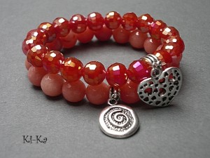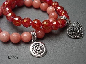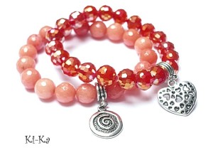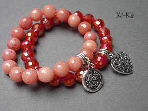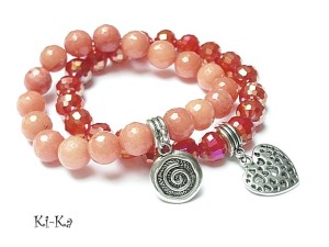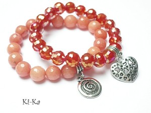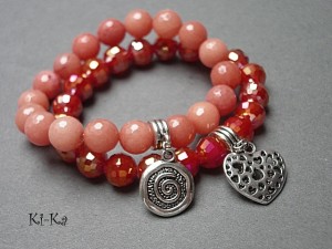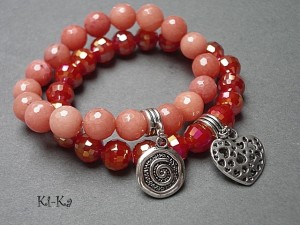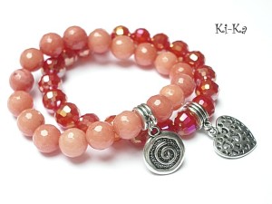 Komplet dwóch bransoletek wykonanych z naturalnych minerałów: jadeity fasetowane [10mm], kryształków [10mm] oraz elementów w kolorze srebra. Bransoletki na gumce silikonowej. Bransoletki będą pasowały na nadgarstek 15,5-16,5cm.