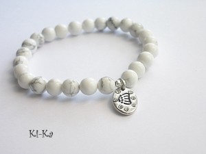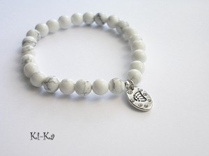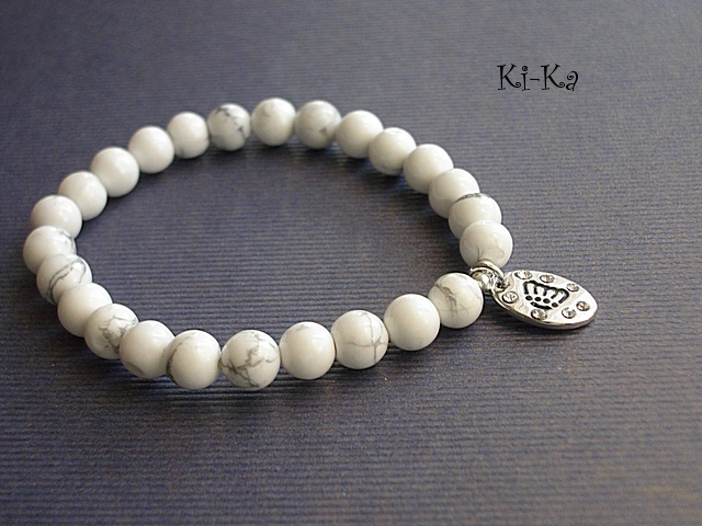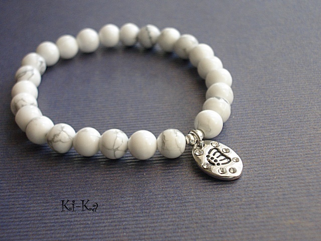 Bransoletka wykonana z naturalnych, kamieni - howlit [8mm] oraz elementów w kolorze srebra [przywieszka wysadzana kryształkami] Bransoletka na gumce silikonowej. Pasuje na nadgarstek 15-16,5cm. Biżuteria ozdobnie zapakowana. Bransoletka może stanowić komplet z innymi modelami - przykładowe zdjęcia