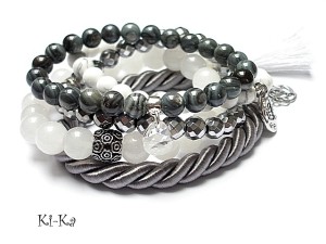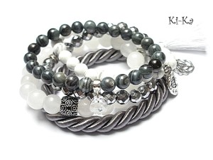 Komplet pięciu bransoletek wykonanych z naturalnych kamieni - agaty [10mm], howlit [8mm], hematyt fasetowany [8mm], muszla szara [8mm] liny skręcanej, satynowego chwosta, kryształka Swarovskiego w kolorze crystal oraz elementów w kolorze srebrnym. Bransoletki z minerałów na gumce silikonowej. Bransoletki będą pasowały na nadgarstek 15-16,5cm. Biżuteria ozdobnie zapakowana.