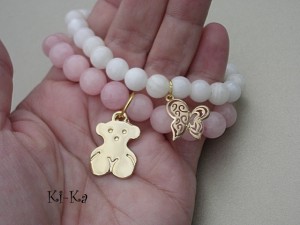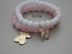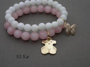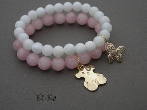 Komplet dwóch bransoletek wykonanych z naturalnych minerałów: jadeitów [10mm], muszli [8mm] oraz elementów metalowych w złotym kolorze. Bransoletki pasują na nadgarstek 15 - 16,5cm. Biżuteria ozdobnie zapakowana.