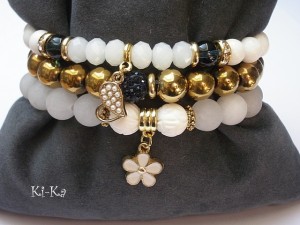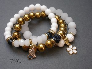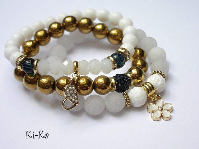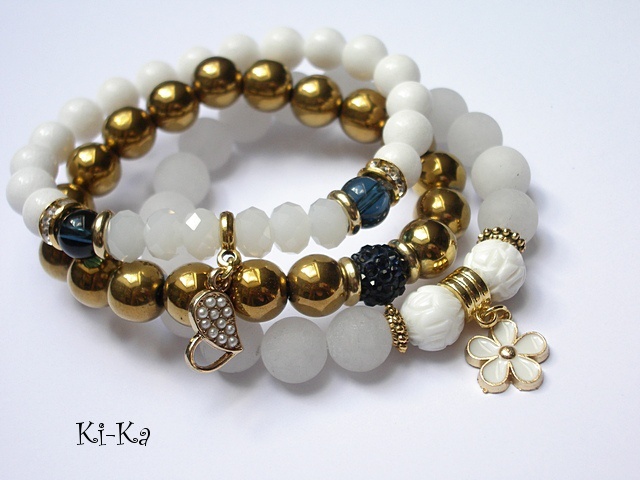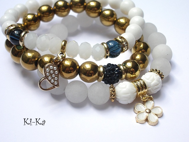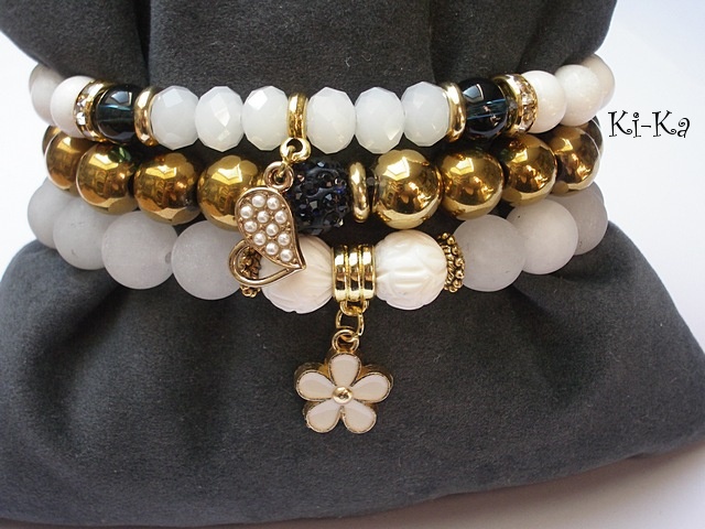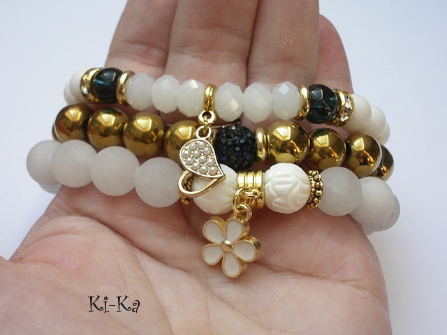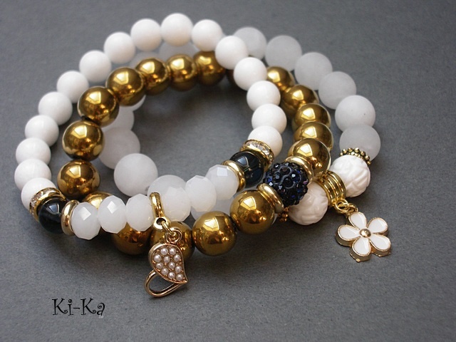 PROJEKT AUTORSKI Komplet trzech bransoletek wykonany z kamieni naturalnych - matowe kuleczki kwarców [10mm] jadeity [8mm] ,złote hematyty [8mm] rzeźbione kuleczki białego korala [10mm] ,szklane kuleczki kryształki [6 x 8mm], przekładki wysadzane kryształkami ,kuleczka shamballa wysadzana kryształkami Swarovskiego [10mm] oraz elementów w kolorze złota. Pasują na nadgarstek 15,5-16,5. Bransoletki na gumce silikonowej. Biżuteria ozdobnie zapakowana