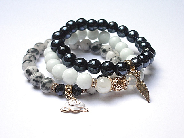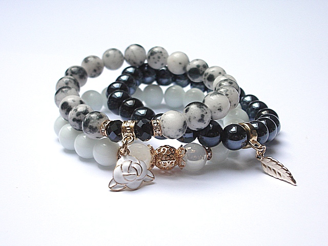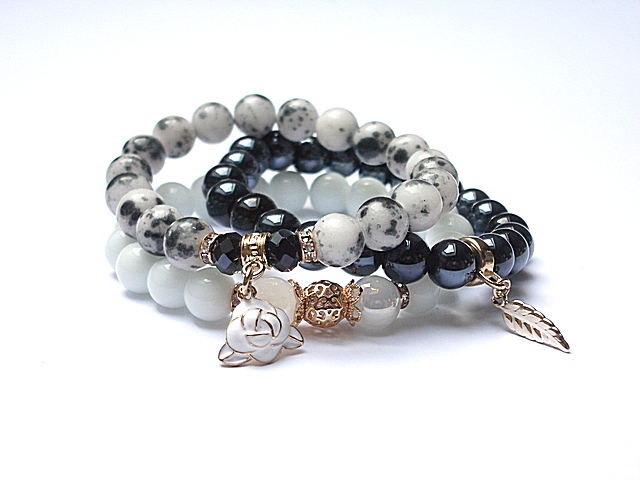 PROJEKT AUTORSKI. . Komplet trzech bransoletek wykonanych z naturalnych kamieni: jadeity [10mm], szkła opalizującego [10mm], fasetowanych kryształków [6 x 8mm] oraz elementów metalowych w kolorze tzw. różowego złota. Bransoletki pasują na nadgarstek 16-17cm. Biżuteria ozdobnie zapakowana