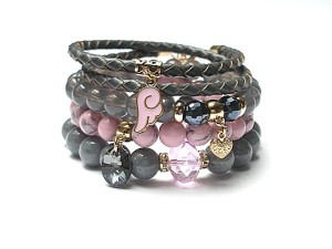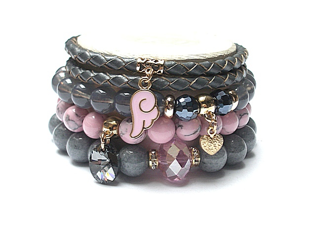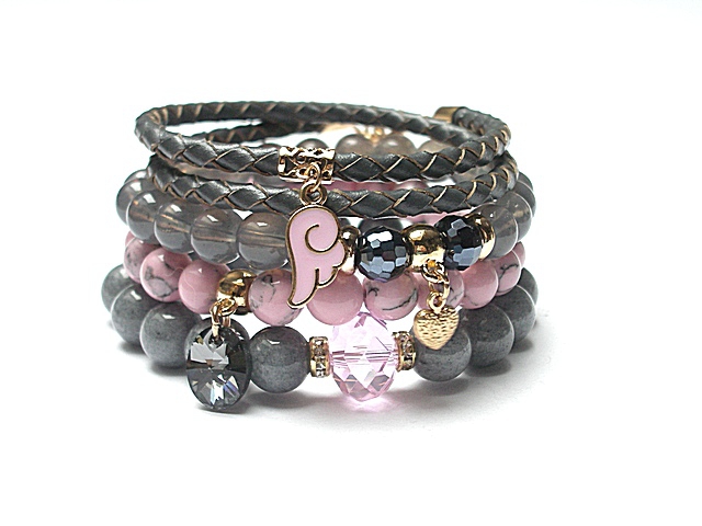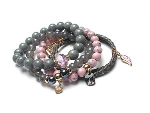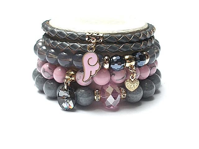 PROJEKT AUTORSKI. WŁASNOŚĆ KI-KA. KOPIOWANIE ZABRONIONE. Komplet czterech bransoletek wykonanych z naturalnych kamieni - howlity [10mm] , marmur [10mm], szkło [10mm], kryształków fasetowanych [8mm oraz 12 x 14mm], rzemienia z naturalnej, plecionej skóry, kuleczki shamballa wysadzanej kryształkami Swarovskiego [10mm] ,zawieszki -kryształka Swarovskiego oraz elementów metalowych w kolorze tzw. różowego złota. Bransoletki pasują na nadgarstek 16-17cm. Biżuteria ozdobnie zapakowana