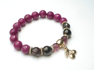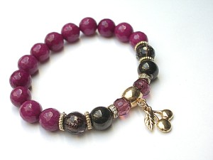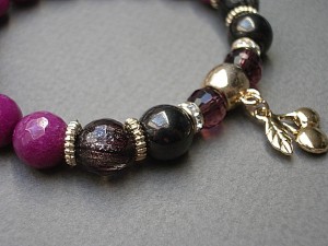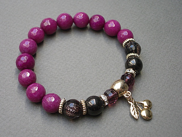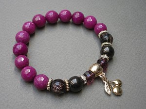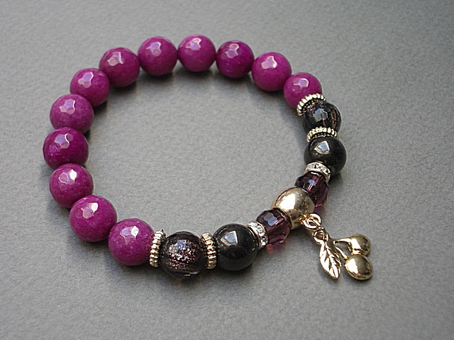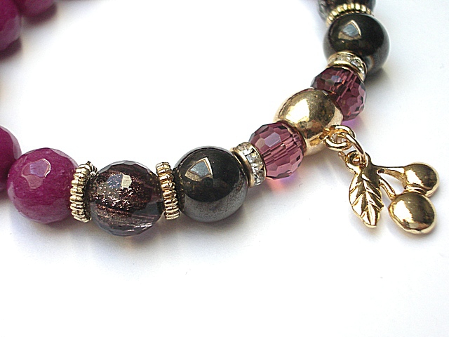 Bransoletka wykonana z naturalnych kamieni - fasetowane jadeity [10mm] ,fasetowany kwarc ze złotymi drobinkami [10mm] ,szklane opalizujące kuleczki w kolorze gorzkiej czekolady [8mm] ,kryształki [8mm] oraz z elementów w kolorze tzw. różowego złota. Bransoletka na gumce silikonowej. Będzie pasowała na nadgarstek 16-17cm. Biżuteria ozdobnie zapakowana