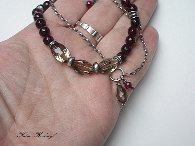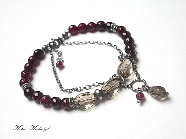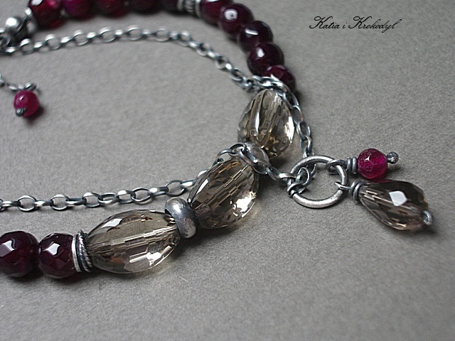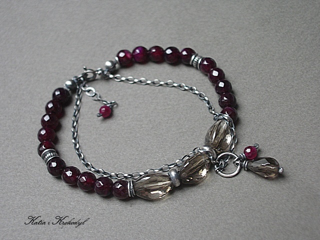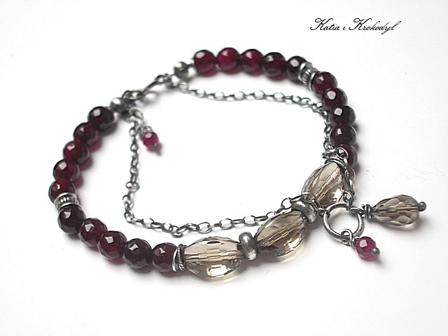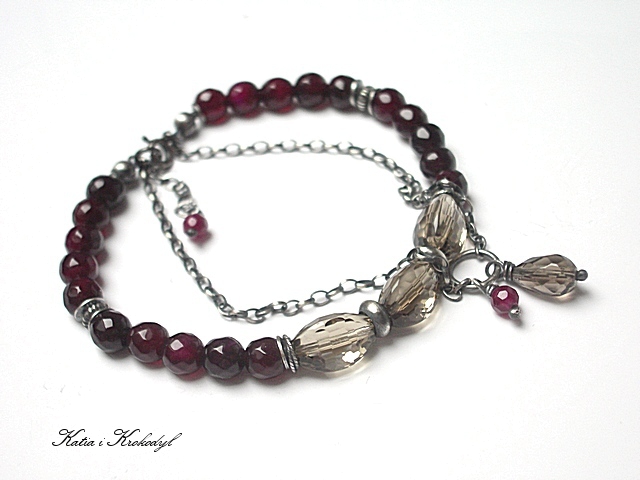 Bransoletka marki Katia i krokodyl. Bransoletka wykonana ze srebra [pr.925] w połączeniu z wysokiej jakości kwarcami dymnymi w kształcie wrzecion [12mm - duża przejrzystość minerałów i połysk] , fasetowanymi kuleczkami agatów [6mm], fasetowanymi kuleczkami jadeitów w wiśniowym kolorze [4mm] oraz kropelką kwarcu dymnego [10mm] . Całość oksydowana i przetarta. Całkowita długość bransoletki około 19,5cm plus 2,5cm ozdobnej przedłużki .Biżuteria ozdobnie zapakowana.