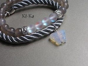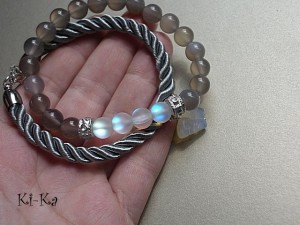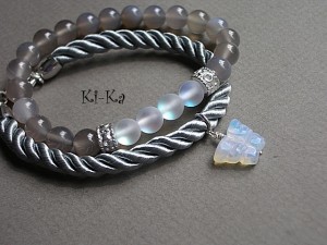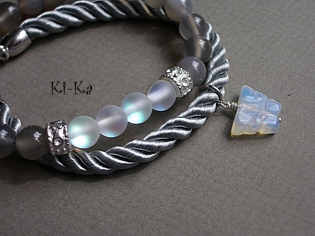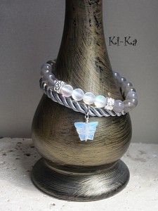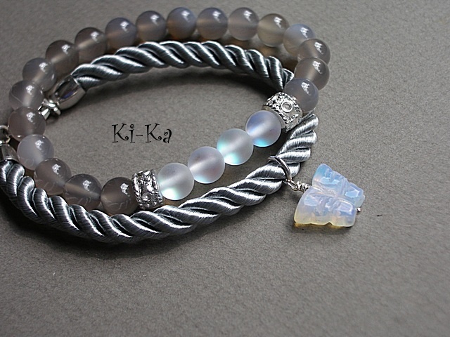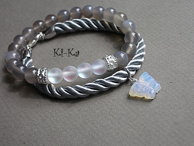 Komplet dwóch bransoletek wykonanych z kamieni naturalnych -agaty [8mm] ,kwarc z efektem AB [8mm] ,motylek z opalitu oraz skręcanej satynowej liny w szarym kolorze i elementów metalowych . Pasują na nadgarstek 15,5 - 16,5cm.
