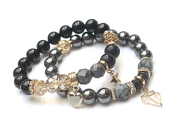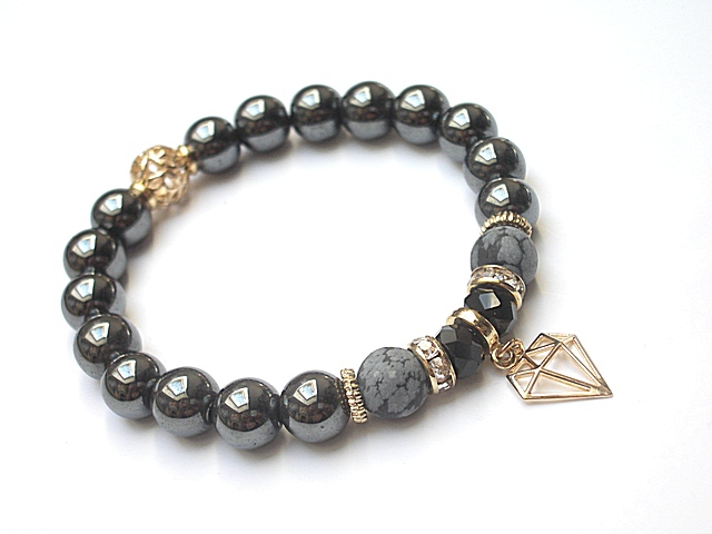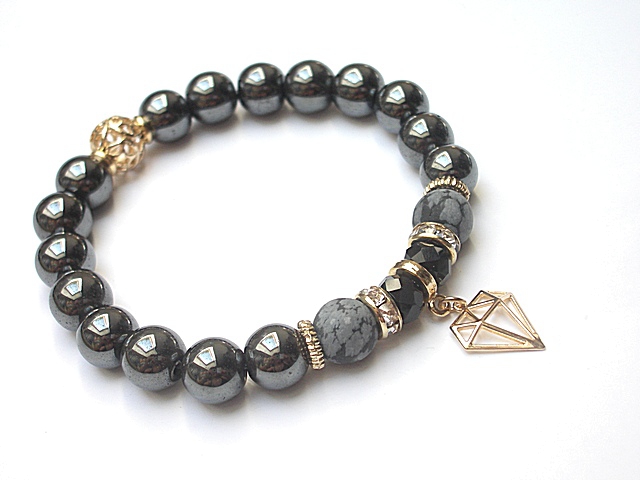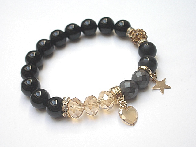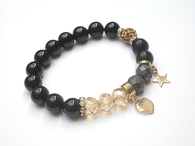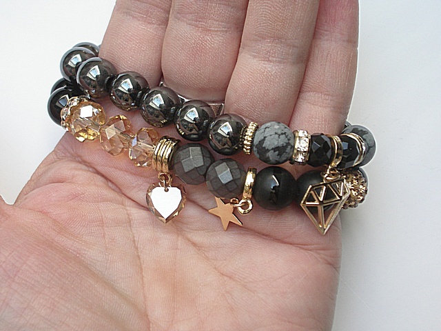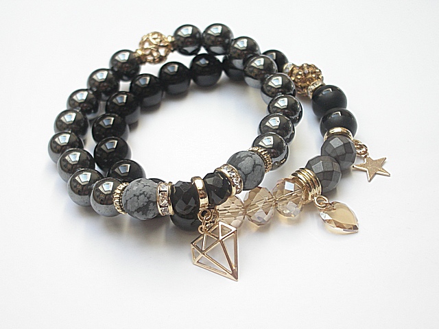 PROJEKT AUTORSKI. WŁASNOŚĆ KI-KA. KOPIOWANIE ZABRONIONE. Komplet dwóch bransoletek wykonanych z naturalnych kamieni - onyks [10mm], hematyt fasetowany [10mm], hematyt [10mm], obsydian matowy [10mm], kryształków fasetowanych [10 x 8mm], przywieszki z kryształkiem Swarovskiego, przekładki shamballa wysadzanej kryształkami Swarovskiego oraz elementów metalowych w kolorze złotym. Bransoletki pasują na nadgarstek 16-17cm . Biżuteria ozdobnie zapakowana