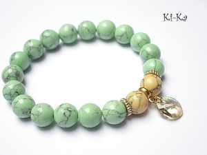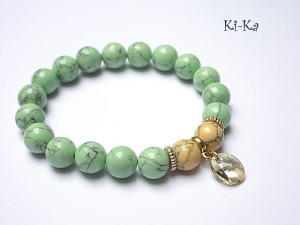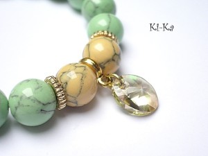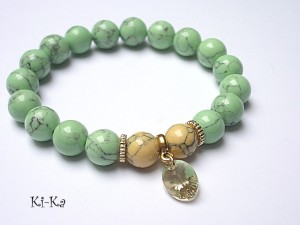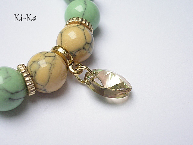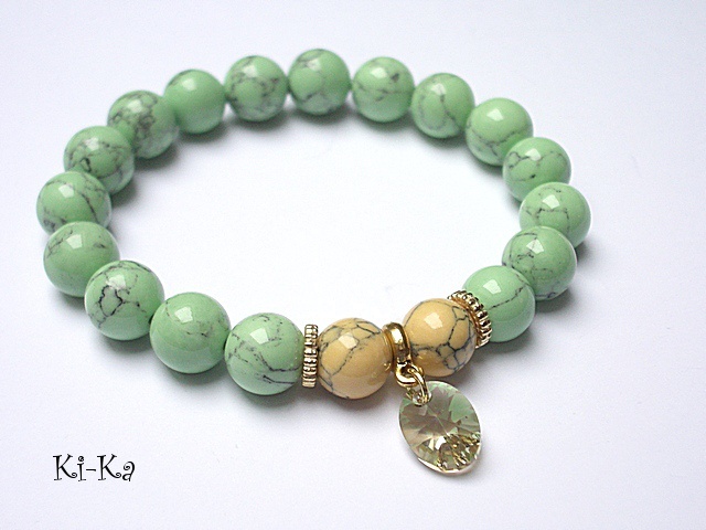 Bransoletka wykonana z kuleczek howlitów [10mm] , kryształka Swarovskiego [10mm] oraz elementów w kolorze złotym . Bransoletka na gumce silikonowej. Pasuje na nadgarstek 16-17cm. Biżuteria ozdobnie zapakowana.